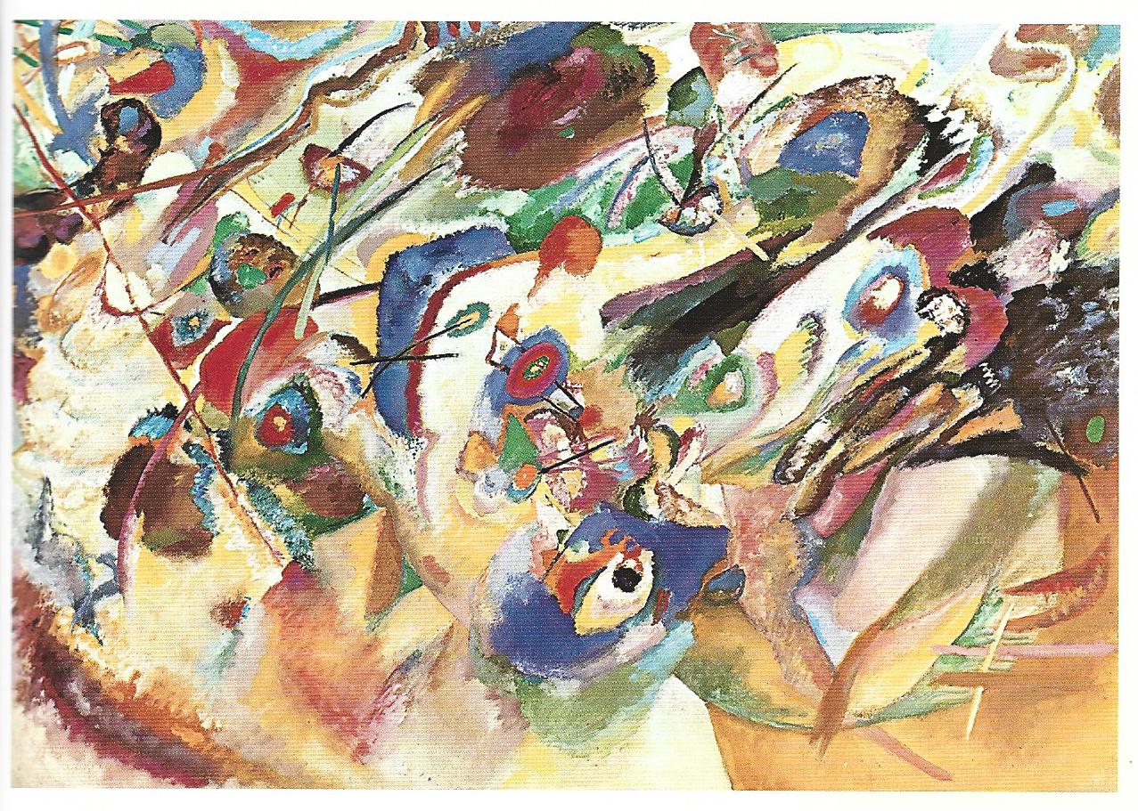 바실리 칸딘스키,&lt;구성Ⅶ을 위한 초벌그림 2, n⁰182&gt;,1913년, 시립미술관 렌비흐하우스, 뮌헨. 이 작품은 칸딘스키의 최우선적 성향인 음악을 연상시킨다. 그는 선과 색, 그리고 음악 사이의 등가를 실현하고자 하였다. 이후 역시 바우하우스의 교수가 되는 작곡가 쇤베르크는 이 작품에서 12음기법과의 대비를 발견하였다. 입체파시기를 겪지 않은 드문 추상화가들 중 하나였던 칸딘스키는 대상에 대한 어떠한 집착도 내보이지 않았다. Ph.ⓒJoachim BlauelⓒADAGP, Paris 1998/T