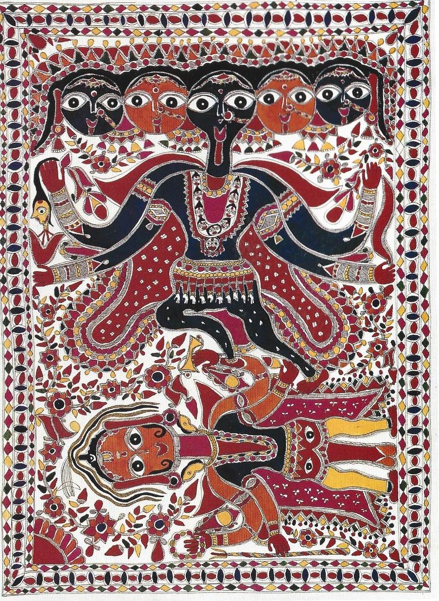 「뿌라나」에 따르면 깔리는 악마의 슘부와 니슘부와의 전투에서 악마를 물리치고 승리한 후에 너무나 즐거워서 죽음의 춤을 추기 시작했다. 살인적인 황홀경 속에서 그녀는 계속해서 파괴를 했다. 모든 신들이 간청을 했지만 그녀를 조용하게 할 수가 없었다. 그녀를 설득시킬 수 있는 방법이 없음을 알아차린 시바는 살해된 악마들이 시신들 가운데 누웠다. 깔리는 자신이 남편의 몸 위에서 춤을 추고 있는 것을 알아차리고는 슬픔과 놀라움으로 혀를 밖으로 내놓았다. 그녀는 놀라 이런 자세로 한참을 있었다. 이것이 깔리 가 붉은 혀를 내밀고 있는 모습으로 묘사되는 이유이다. p67