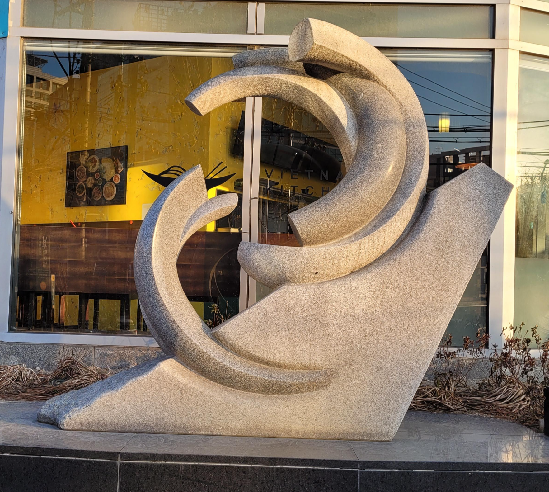 본 작품은 새롭게 들어서는 도시적인 소재와 형태의 건물에 사람들이 모여들고 그들의 삶이 그 속에서 새롭게 형성되어 가는 모습을 조형적으로 표현하였다. 서로 뒤얽힌 곡선 덩어리는 좌대 역할을 하는 하단부 덩어리에서부터 솟아 나오는 흔적이 표현되어, 마치 무기체인 돌에서 유기체인 새로운 생명이 만들어지듯 새로운 생명력의 탄생을 의미한다.