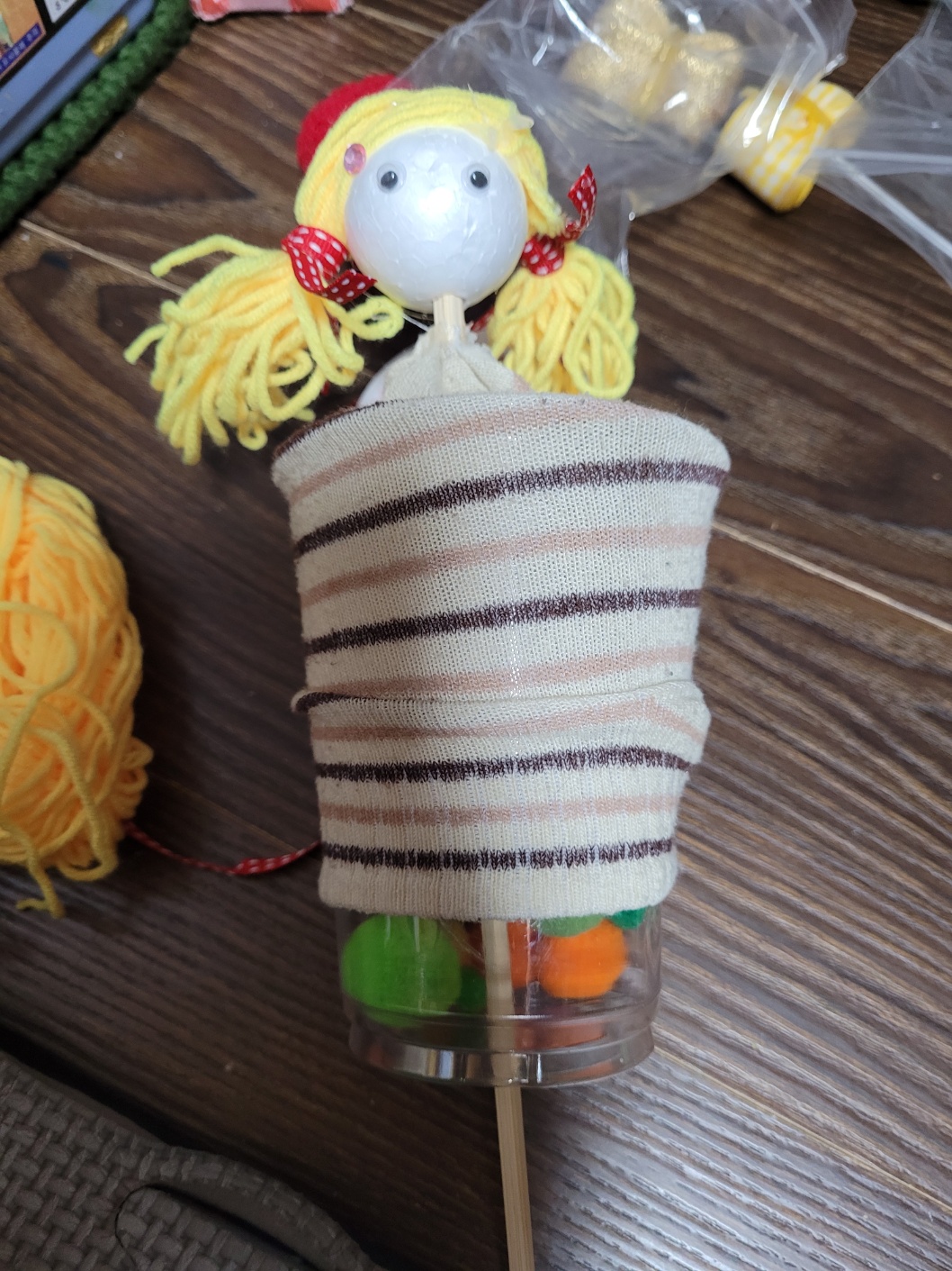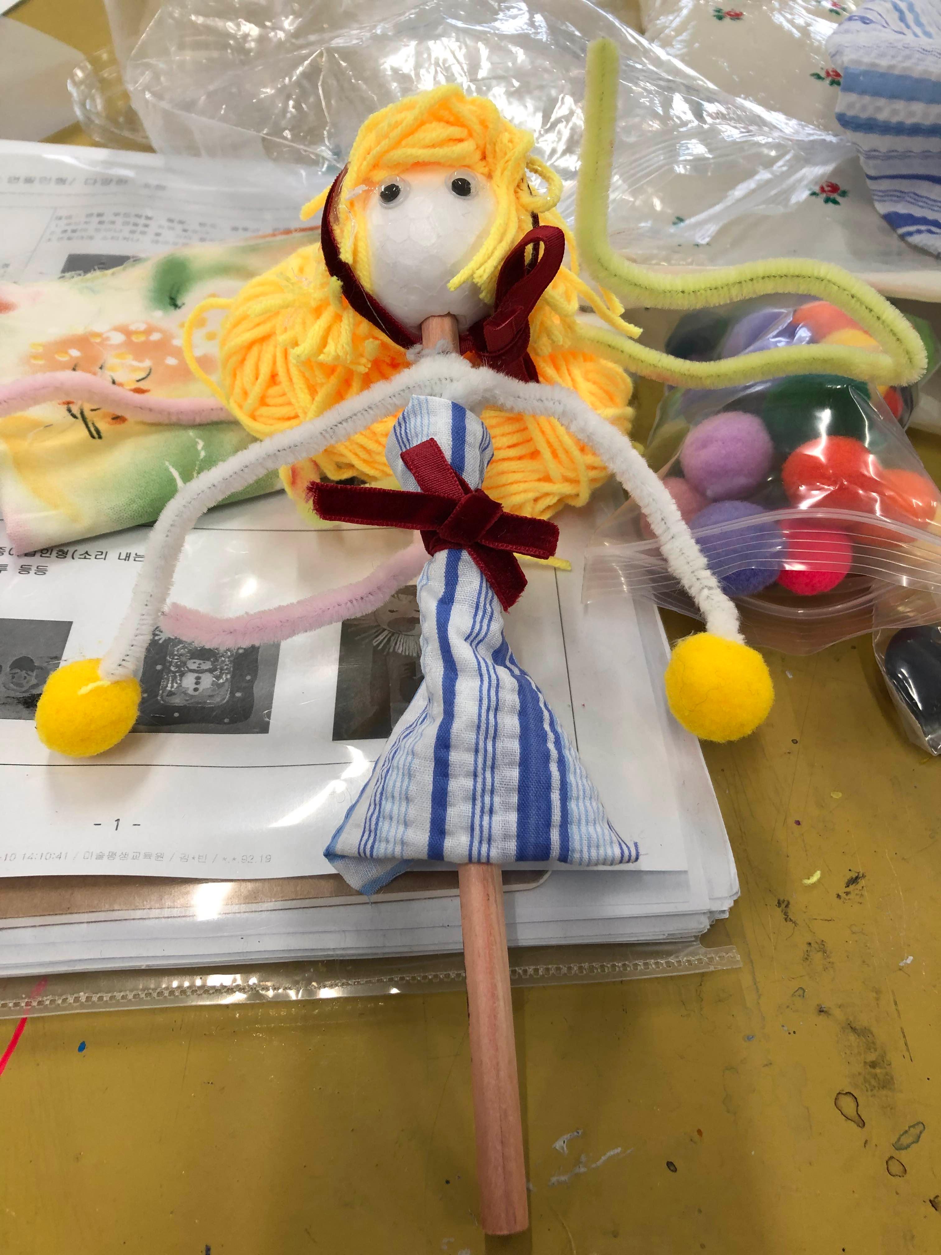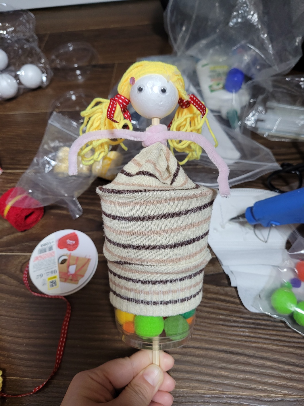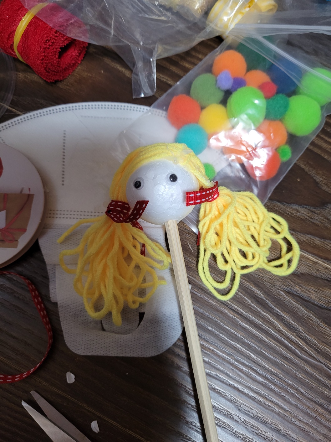 노란색 털실을 길게 뭉쳐서 글루건으로 붙인 후 리본으로 묶어 주어 양갈래 머리카락을 만들었는데요.