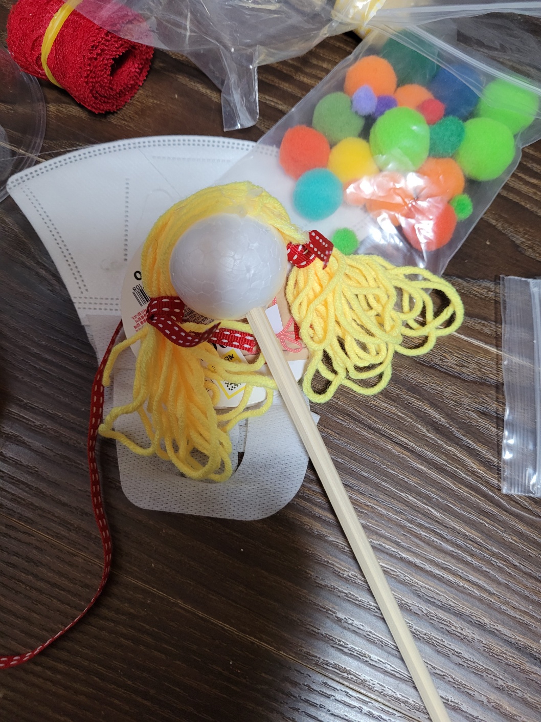 노란색 털실을 길게 뭉쳐서 글루건으로 붙인 후 리본으로 묶어 주어 양갈래 머리카락을 만들었는데요.