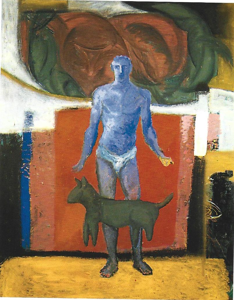 산드로 키아, <푸른개의 전설>,1988년, 다니엘 탕플롱 갤러리, 파리, 캔버스 위에 유채, 132×126Cm 트랜스아방가르드의 선구자인 아킬레 보니토 올리바는 이렇게 썼다. “키아의 문화적 방랑벽은 이중의 기억을 가진 장소에 있다. 이 이중의 기억이란 유럽 미술 스타일의 위대한 전통, 그리고 대중 사회에서 이용되는 이미지의 일상적인 제작을 의미한다.” 따라서 패러디적인 기억의 아이러니는 비록 가장 피상적인 것이라 할지라도, 키치나 지시적 효과, 이미지의 과도함을 두려워하지 않는다. Ph. G. Poncet ⓒ de la galerie/T ⓒADAGP,1999