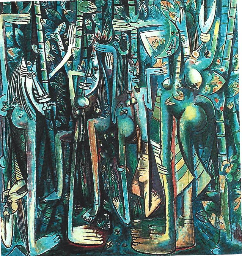 위프레도 람,<정글>,1942~1943년,MOMA,인터 아메리칸펀드, 뉴욕, 캔버스 위에 붙인 종이 위에 과슈. 239.4×229.9Cm 이 선명한 작품은 람이 쿠바로 회귀함을 나타낸다. 이 작품과 더불어 마침내 국제 미술 무대에 제 3세계가 등장했으며, 혼혈종의 세계적 미술이 나타남으로써 기존의 문화적 지형도가 깨지게 되었다. 람은 다음과 같이 말한다. “여기에서 인간은 여전히 숲의 잔해들을 간직한 채 식물 상태에서 동물 상태로 옮겨간다. 치명상을 입힐 준비가 된 칼은 주의 깊고 불안한 존재가 된다...부드럽거나 잔인한 성은 마치 번개와 같다....” Ph. ⓒ du musée/T ⓒADAGP, 1999